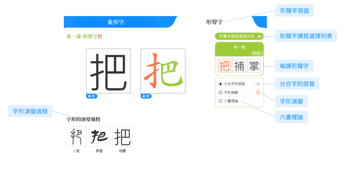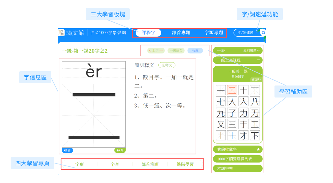 (1)點擊任意課程字,頁面會展示該字的字音、字形及簡明釋文。