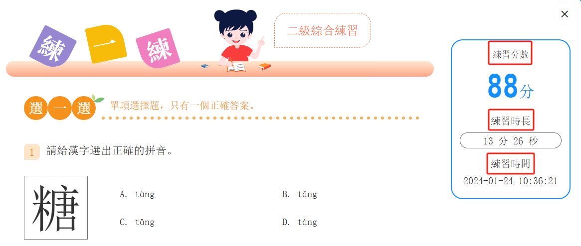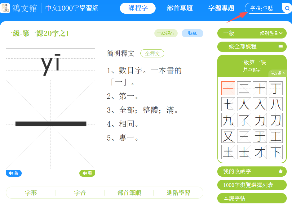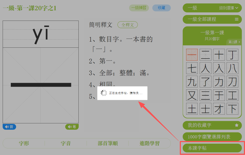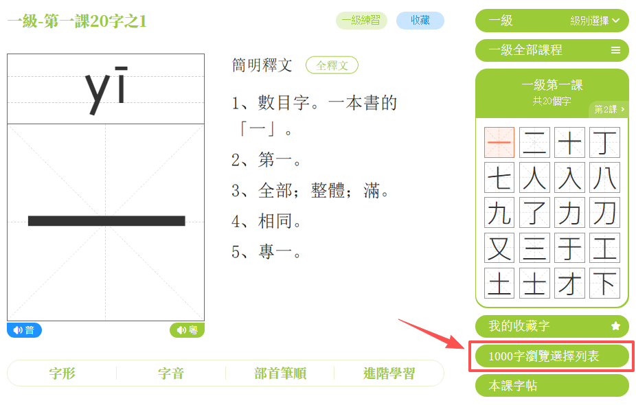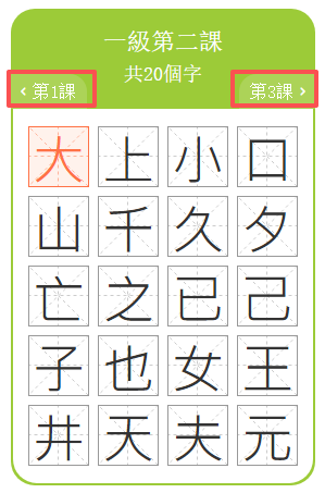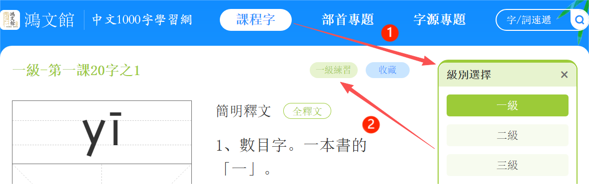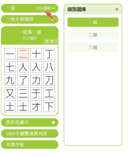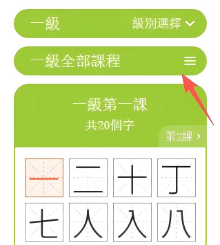 打開課程字頁面,點擊「一/二/三級練習」鍵,進入練習頁面。