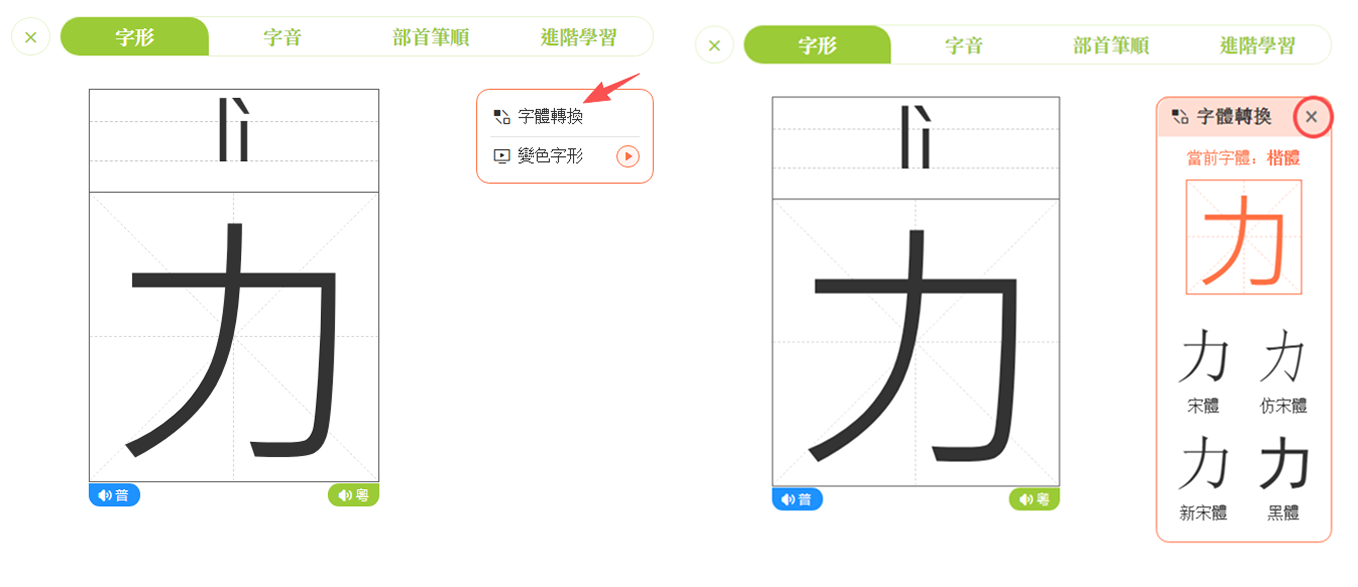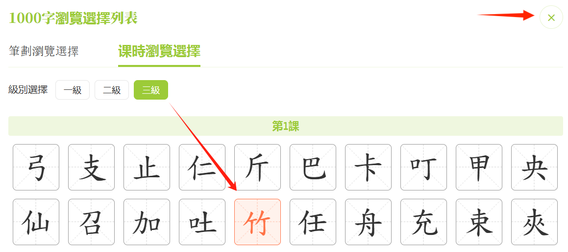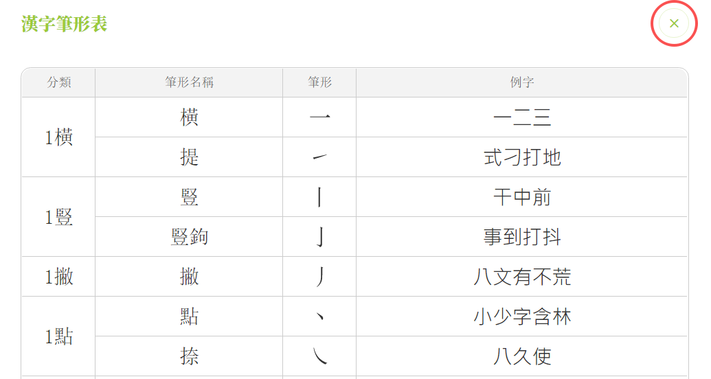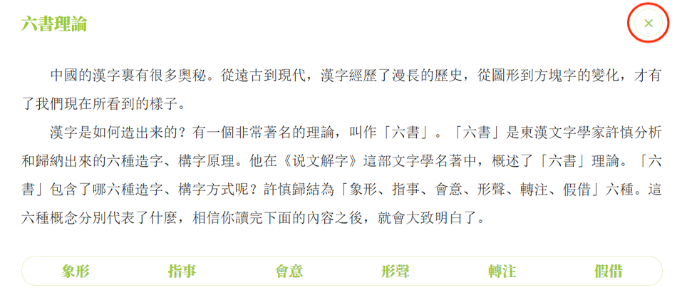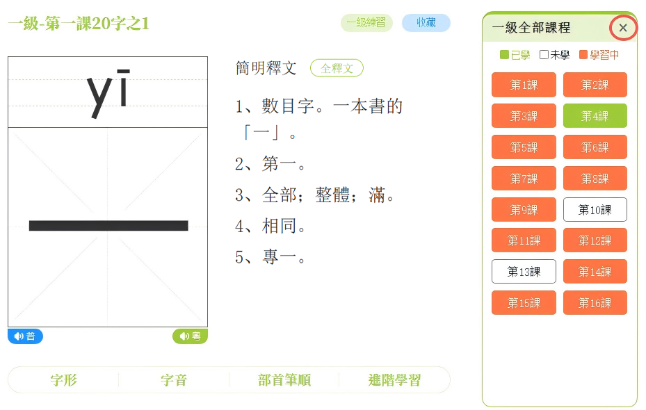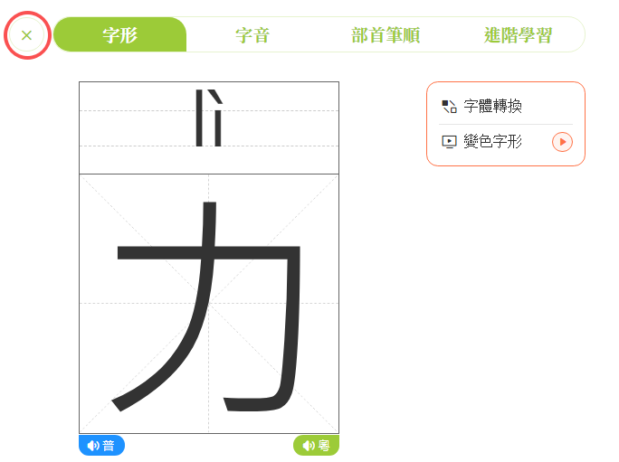 點擊左上方的「×」,即可關閉字形學習頁面。