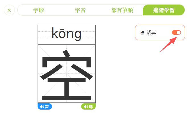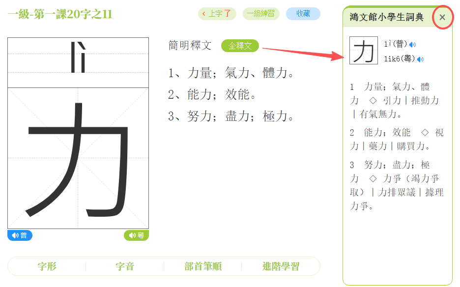 提示:「字音」「部首筆順」「進階學習」頁面關閉的方法如上,後面不再贅述。