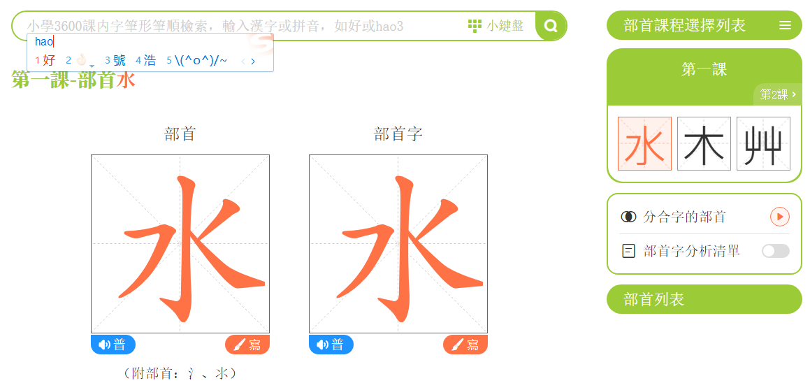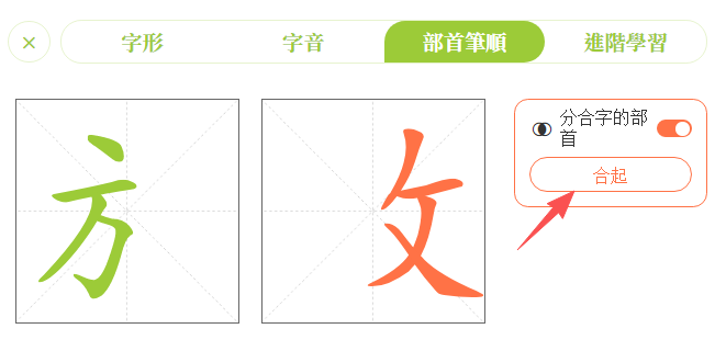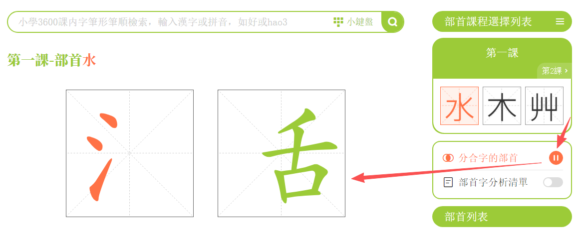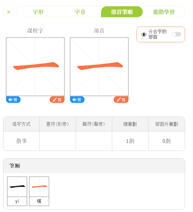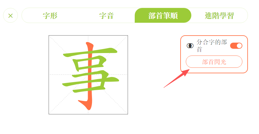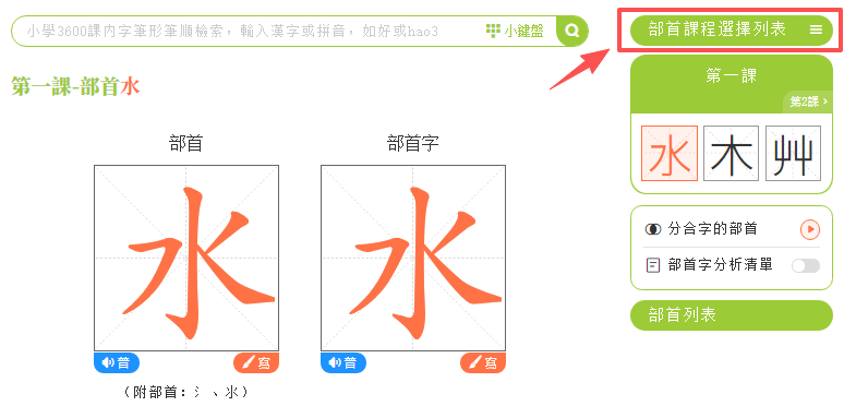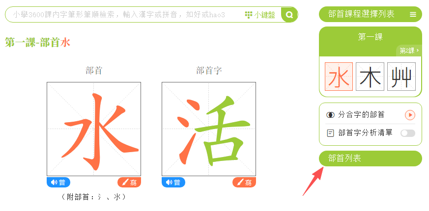 點擊「部首筆順」,進入學習頁面。