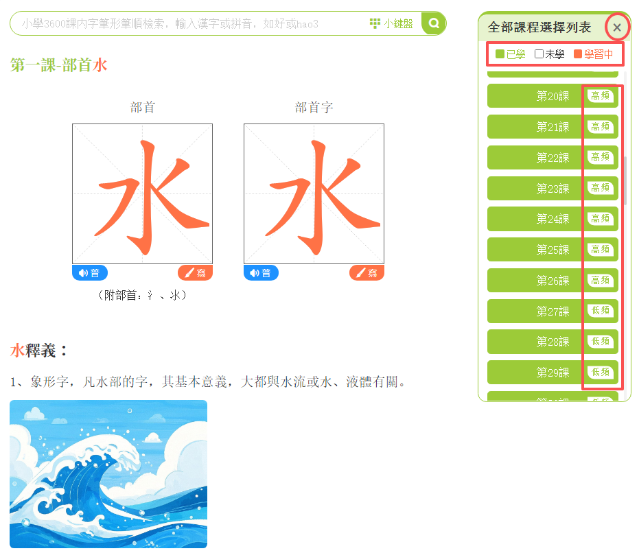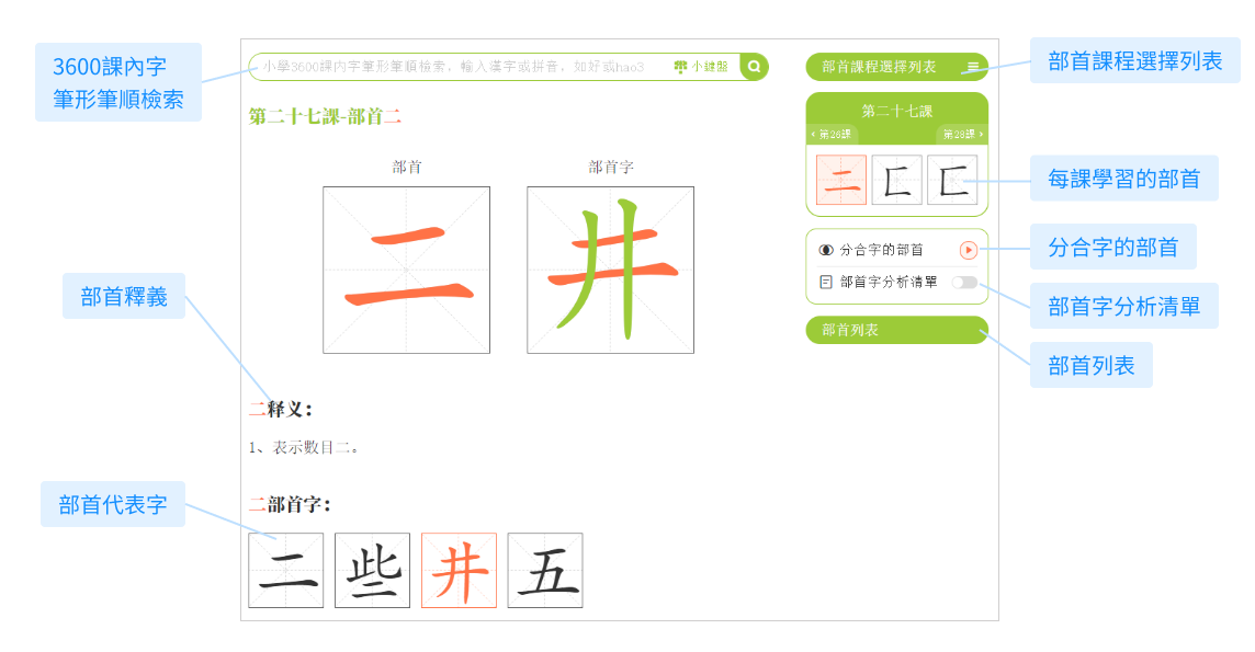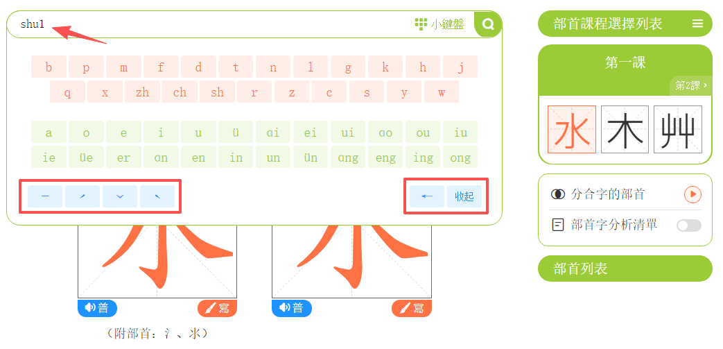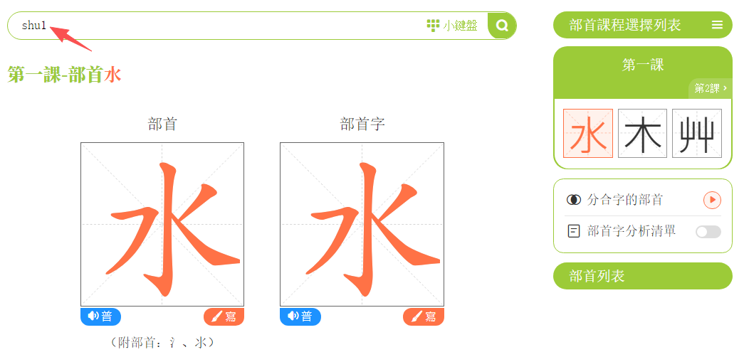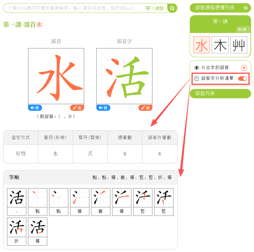 點擊「部首筆順」,進入學習頁面。