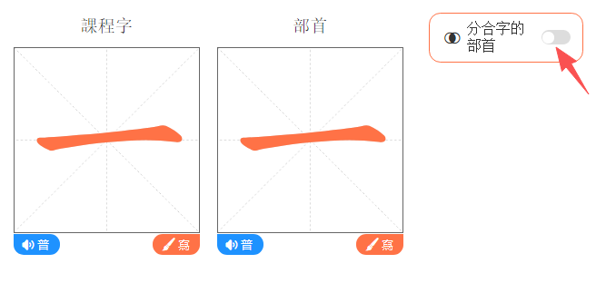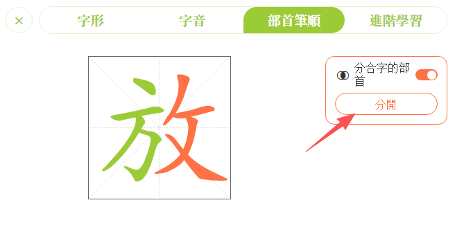 ②點擊「部首閃光/分開」鍵,橙色的部首會閃光顯示/分開展示。