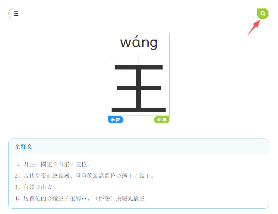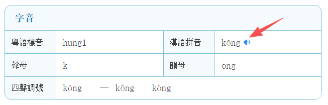 鼠標移到拼音的右下角會自動出現語音小喇叭,頁面上一共有三個小喇叭,點擊對應的小喇叭即可播放對應的語音。同時字下方有全釋文可供查看。