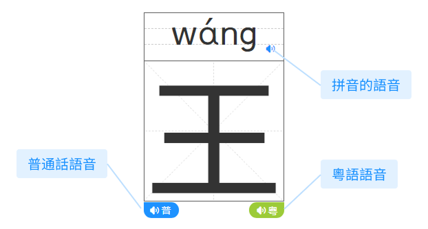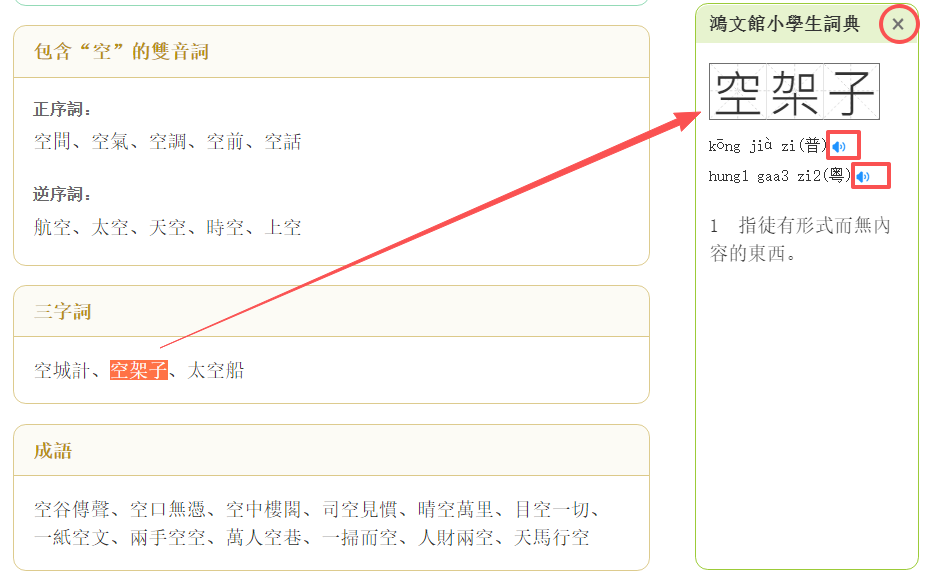 ③分別點擊右欄詞典的「(普)」和「(粵)」的「發音」鍵,可播放字詞的語音。
