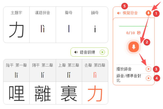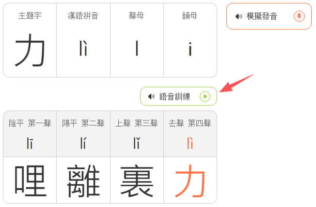該頁面的學習內容包含主題字、漢語拼音、聲母、韻母、四聲讀音代表字,工具欄內設有「語音訓練」、「模擬發音」兩個指令鈕。