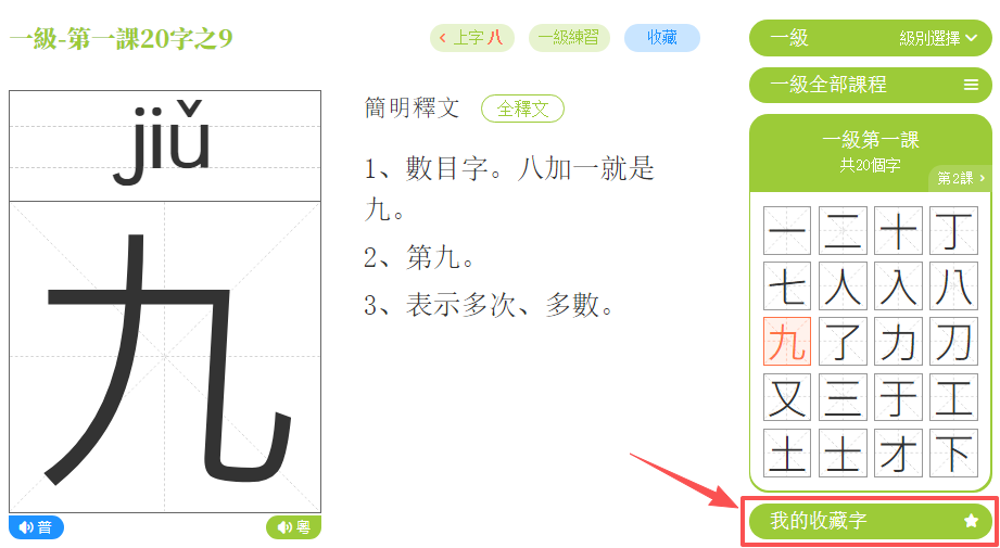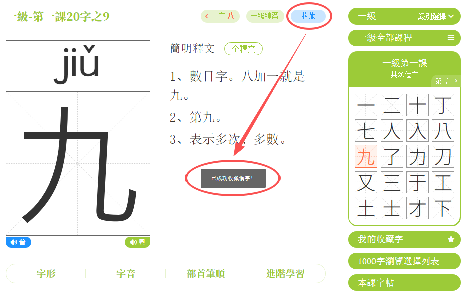 點擊「收藏」鍵,可以收藏當前的課程字。