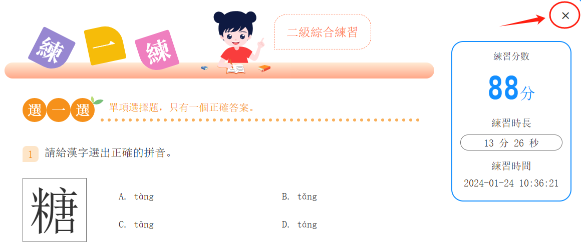 點擊右上角的「×」,關閉練習頁面。
