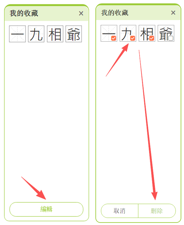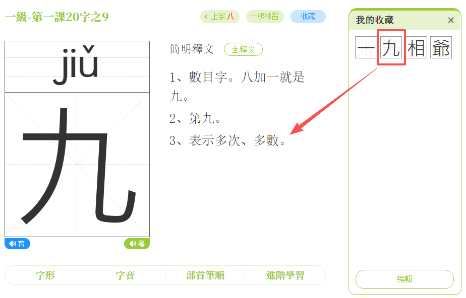 ②點擊任意收藏字,可以重新進入該課程字頁面進行複習。