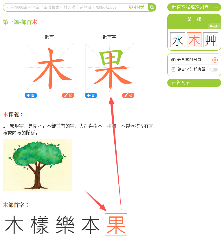 1.點擊任意一個部首字。如:點擊「果」,頁面顯示部首字「果」的學習頁面。