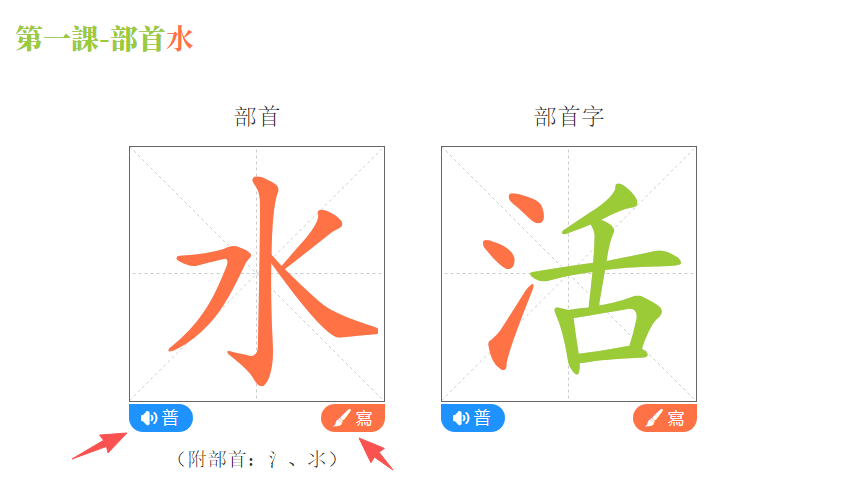 點擊部首/部首字右下方橙色小圖標,即可播放筆順動畫。