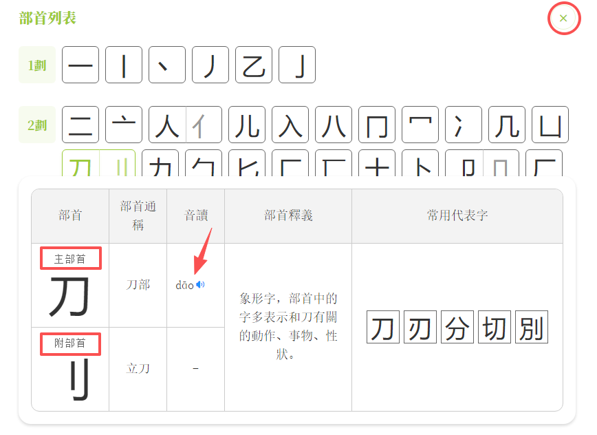 2.點擊部首/部首字左下方藍色小圖標,即可播放普通話讀音。