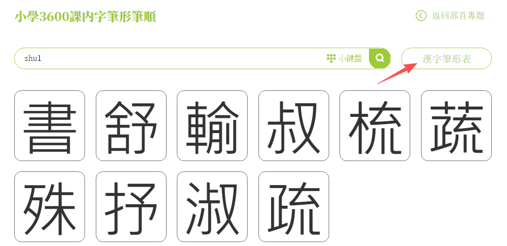 (1)在「小學3600課內字筆形筆順」檢索頁面中,檢索欄右邊有一個「漢字筆形表」,點擊進入頁面。該表中將漢字筆形進行了分類,展示了筆形及其名稱、例字。