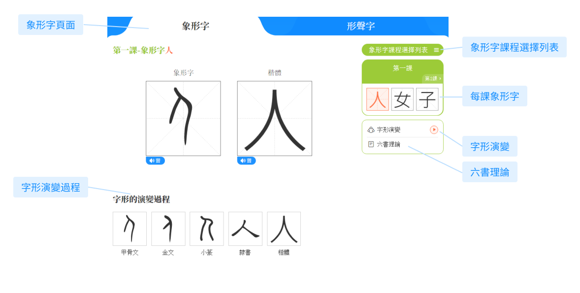 點擊「字形演變」鍵,頁面左下方會自動彈出象形字的演變解說文字,並同步演示該字甲骨文、金文、小篆、隸書、楷體等字形演變過程。演示完畢後,頁面自動恢復。