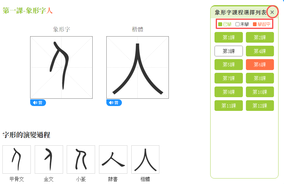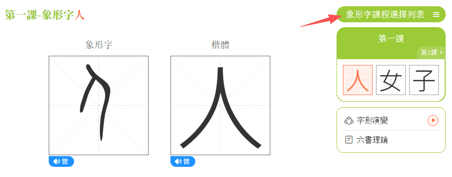 (1)點擊「象形字課程選擇列表」。
