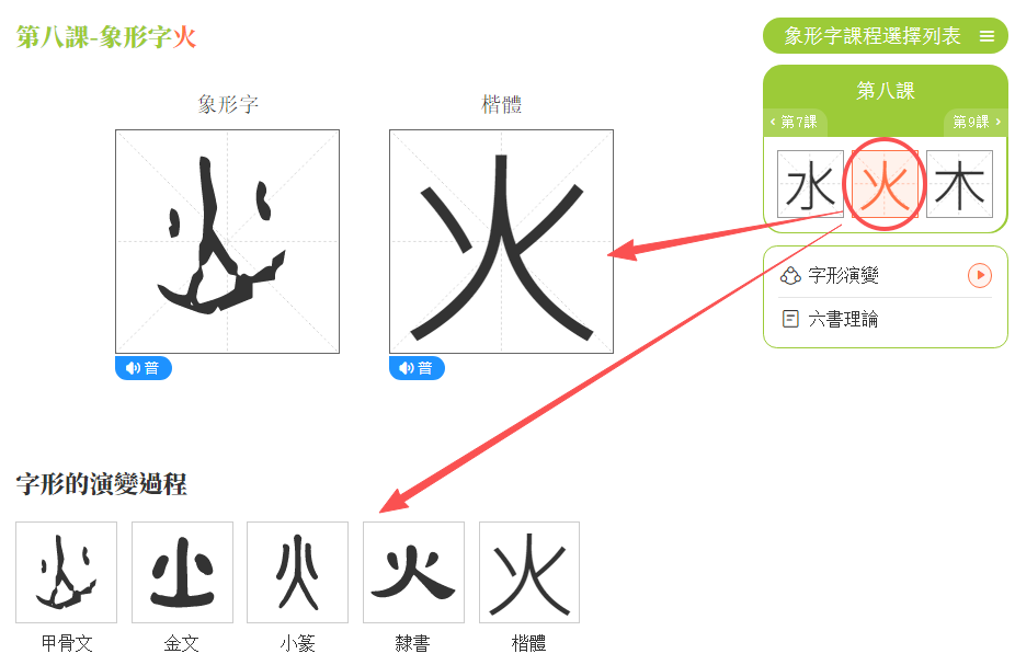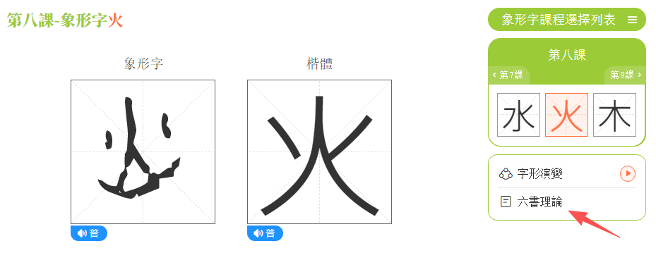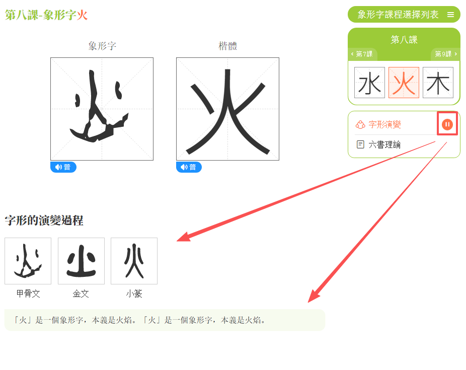 (1)點擊任意一個象形字。如:點擊「火」,頁面顯示象形字「火」的學習內容。