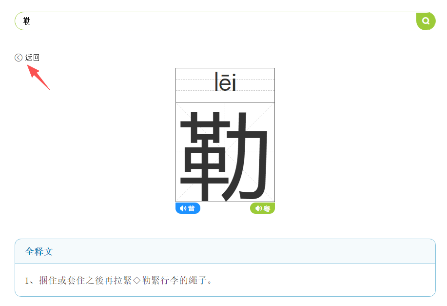 提示:如果是多音字,搜索完之後點擊想要查看的音即可。點擊「返回」可返回上一頁面。