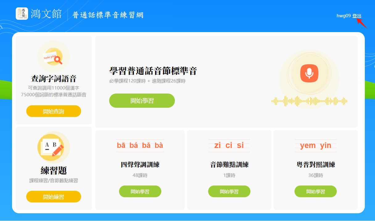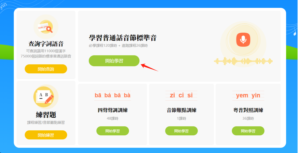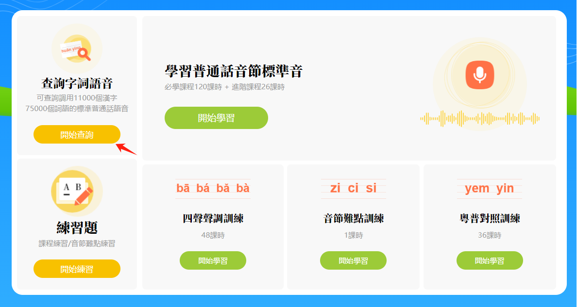 首頁一共有六大版塊,我們將這六大板塊分成兩個部分:一、「學習普通話音節標準音」主課程及其輔助課程,以及相應的練習題;二、「查詢字詞語音」功能。