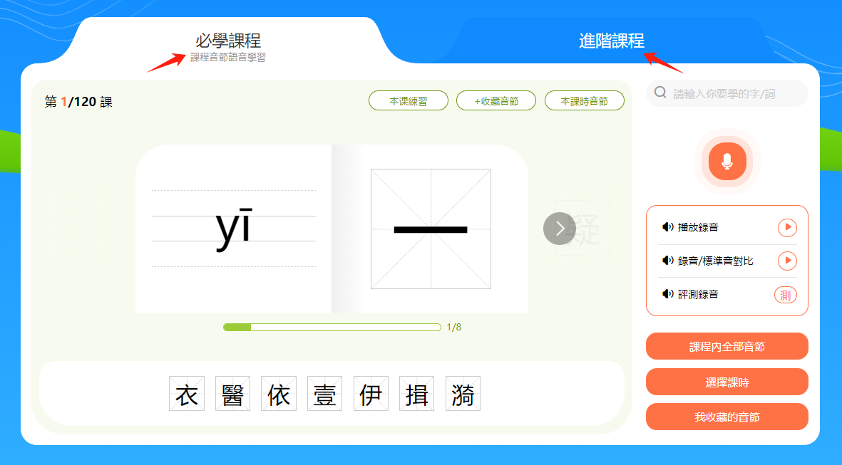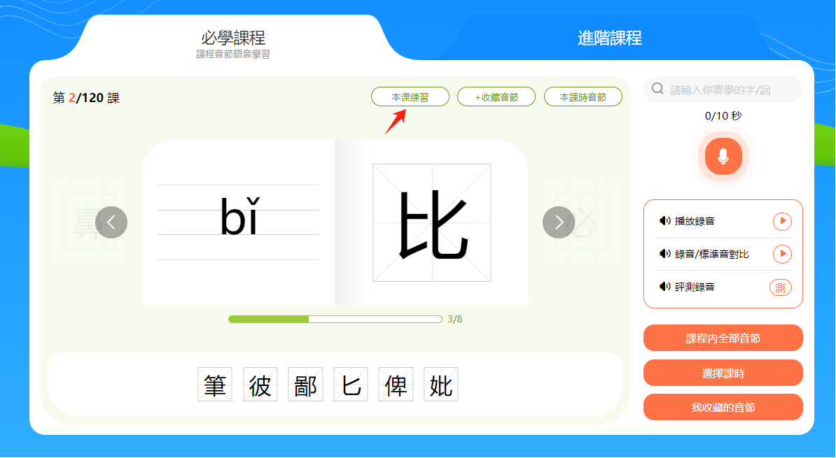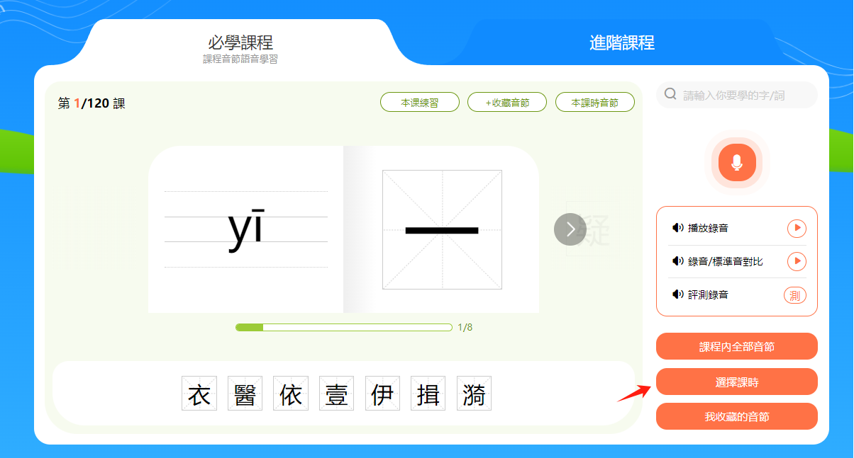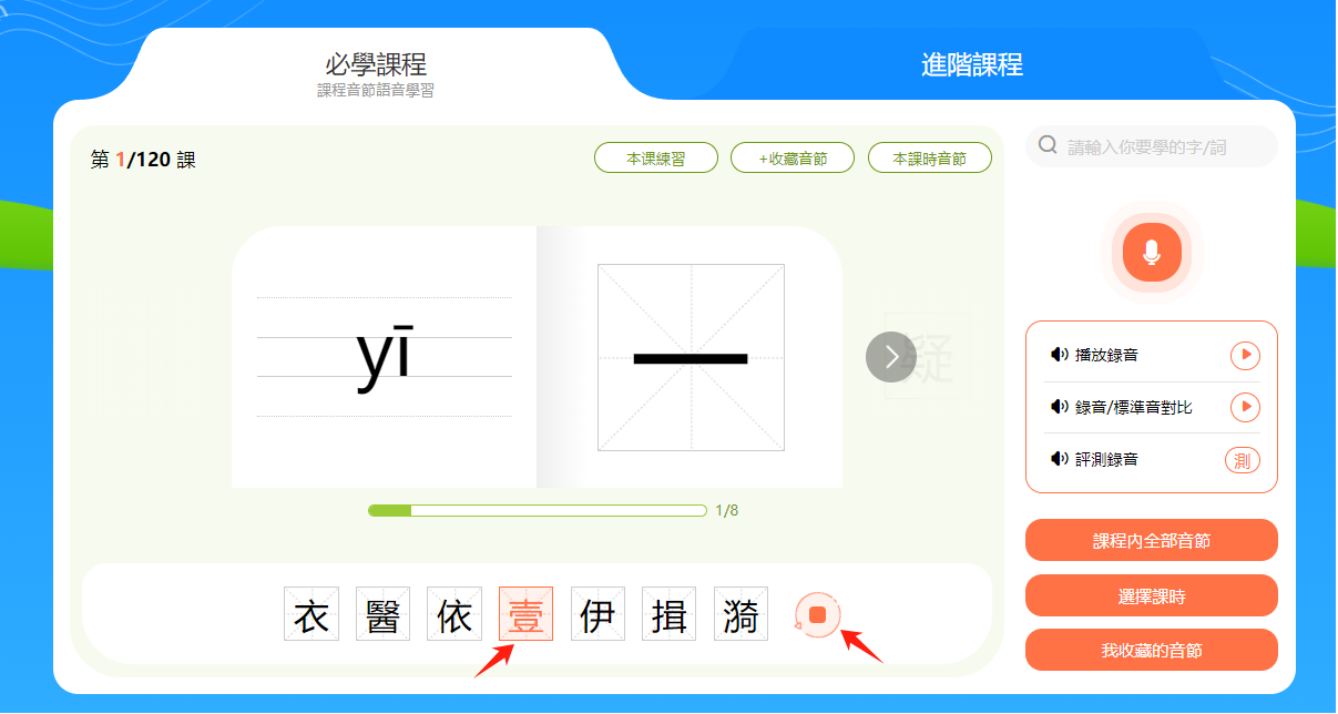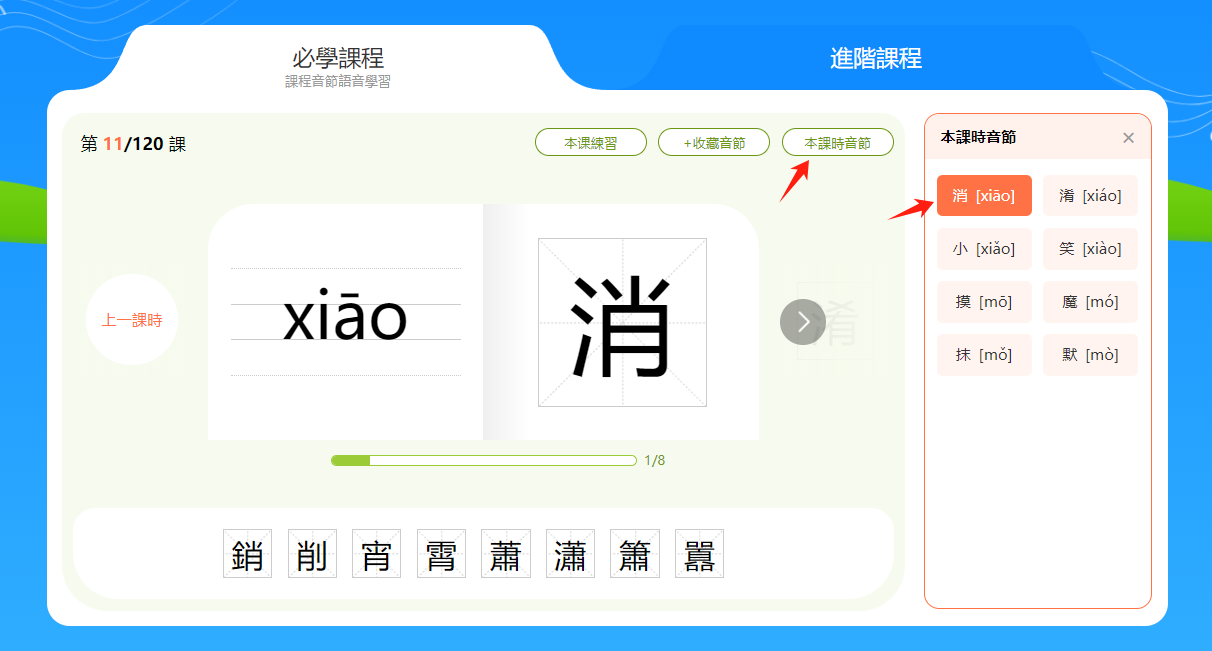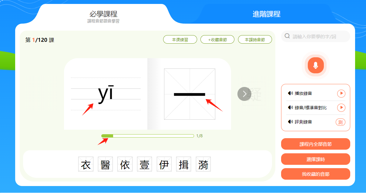 小提示:音節和漢字下方有一個進度條,會顯示本節課時的學習進度。