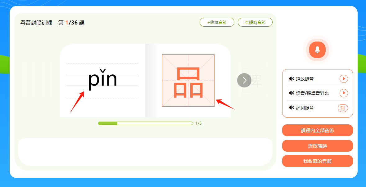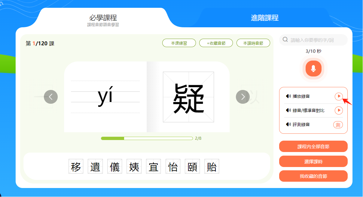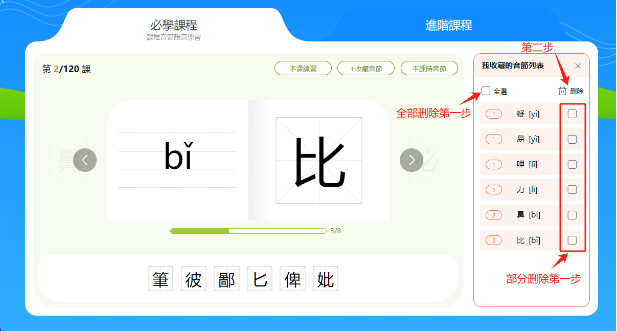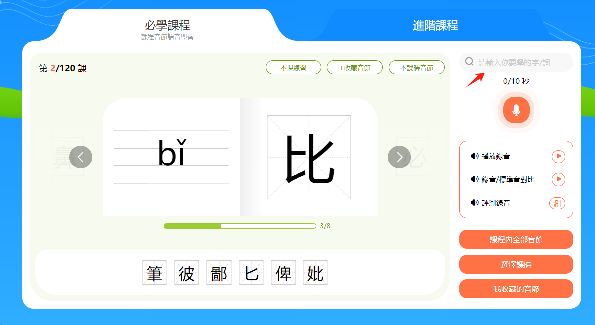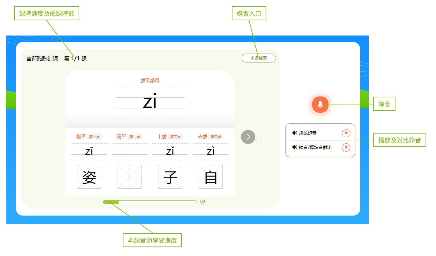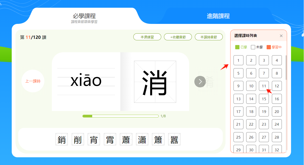 小提示:音節和漢字下方有一個進度條,會顯示本節課時的學習進度。