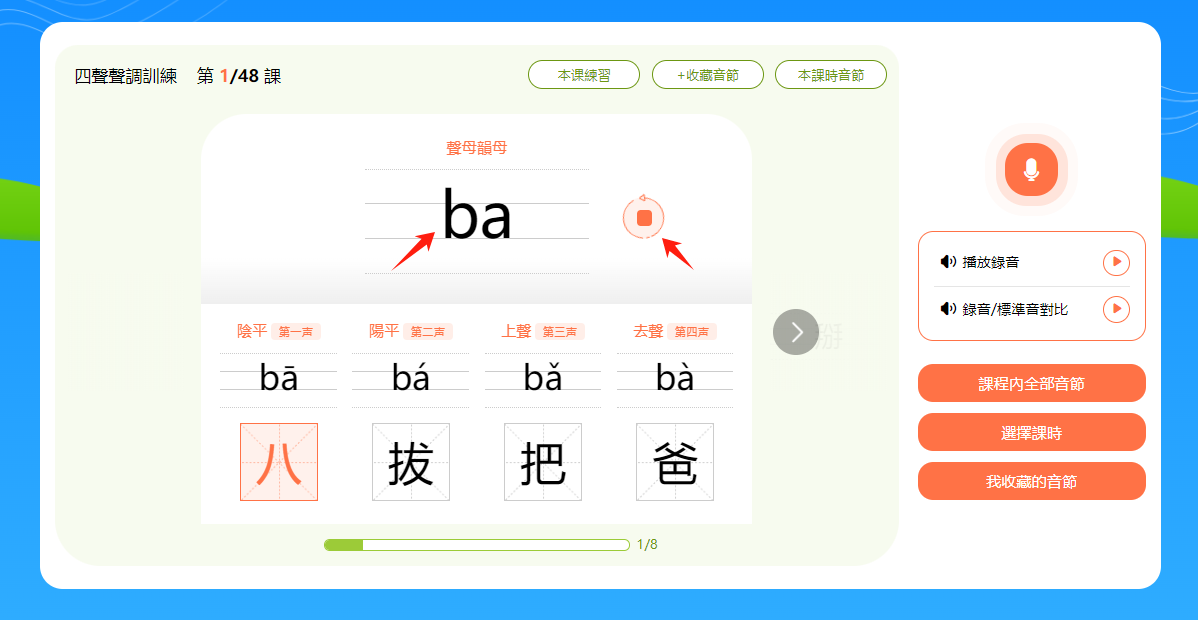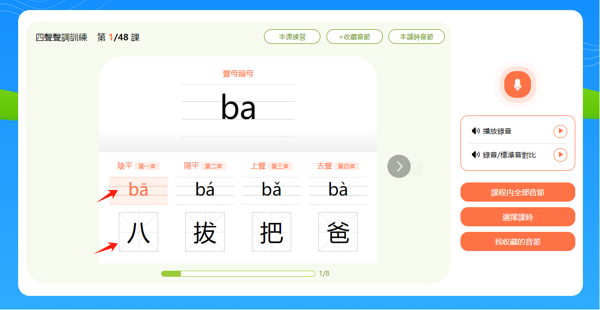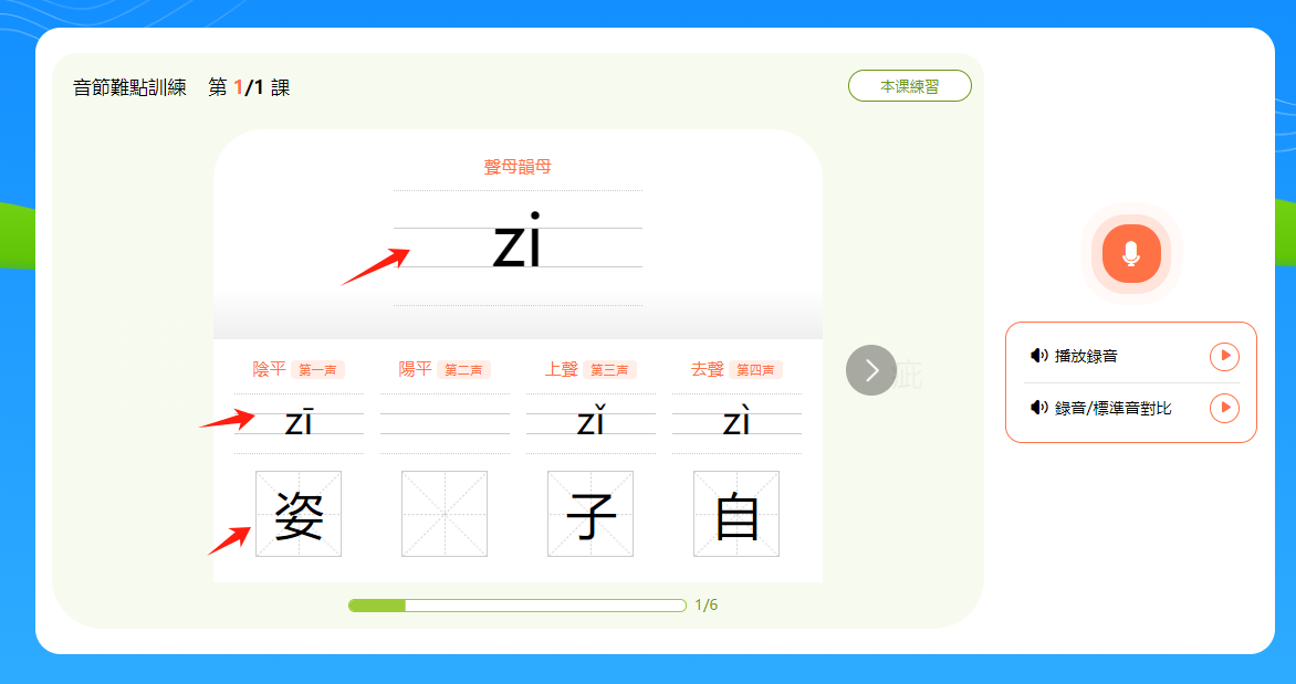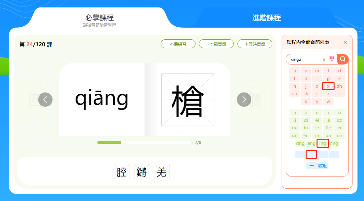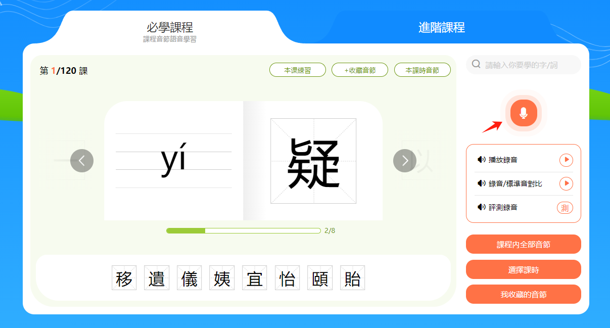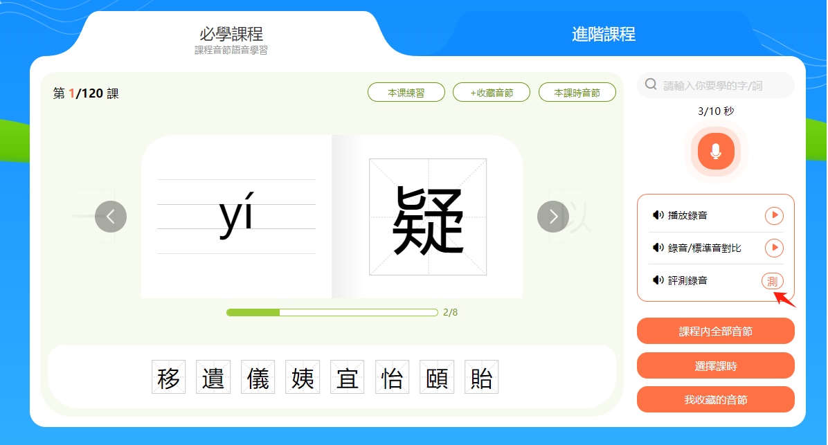 小提示:音節和漢字下方有一個進度條,會顯示本節課時的學習進度。