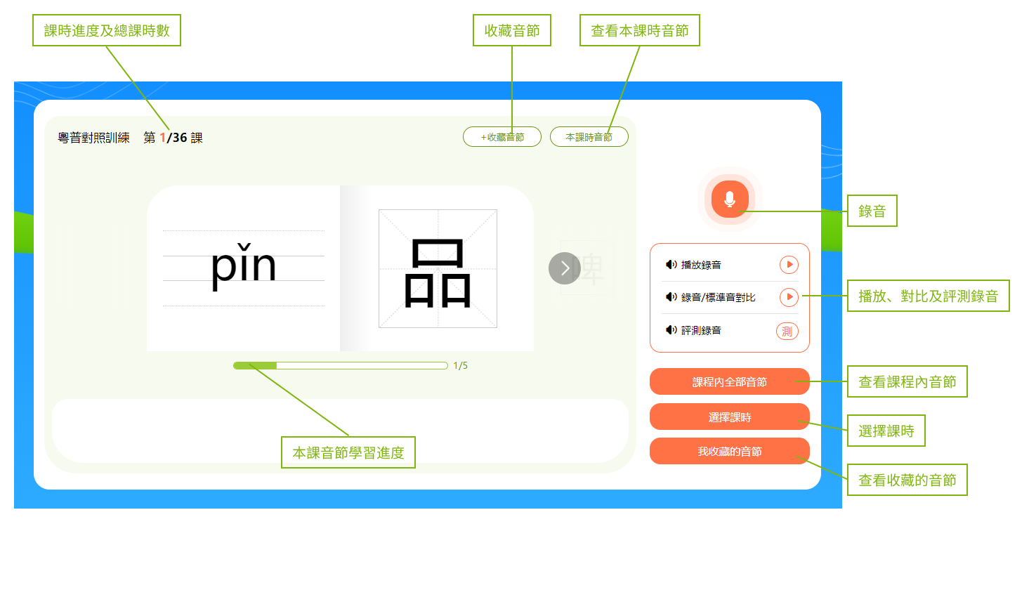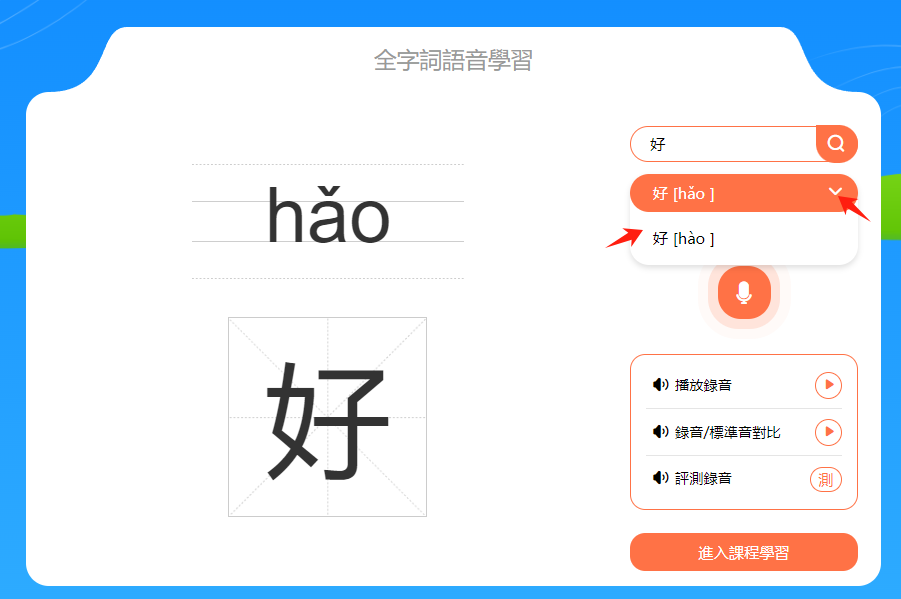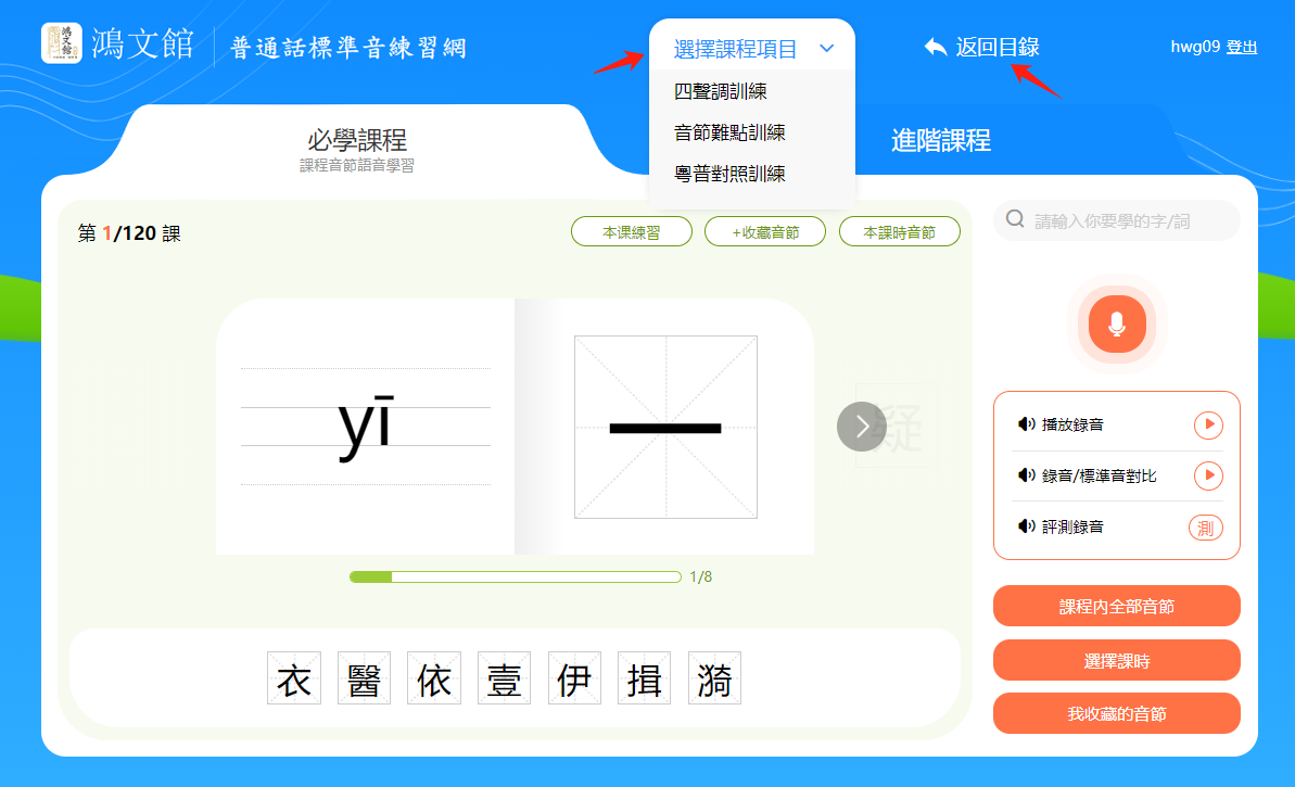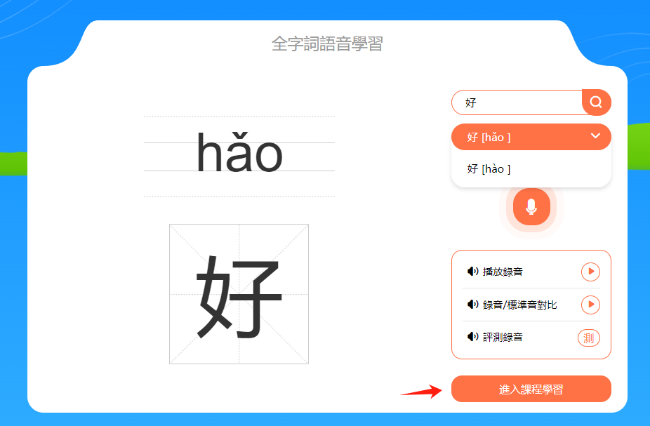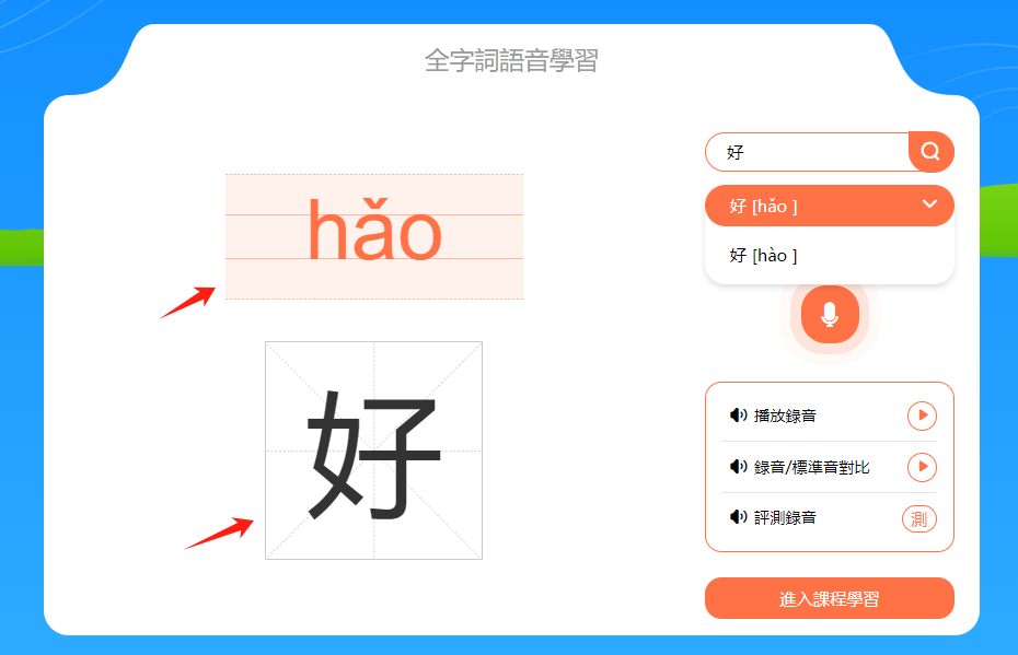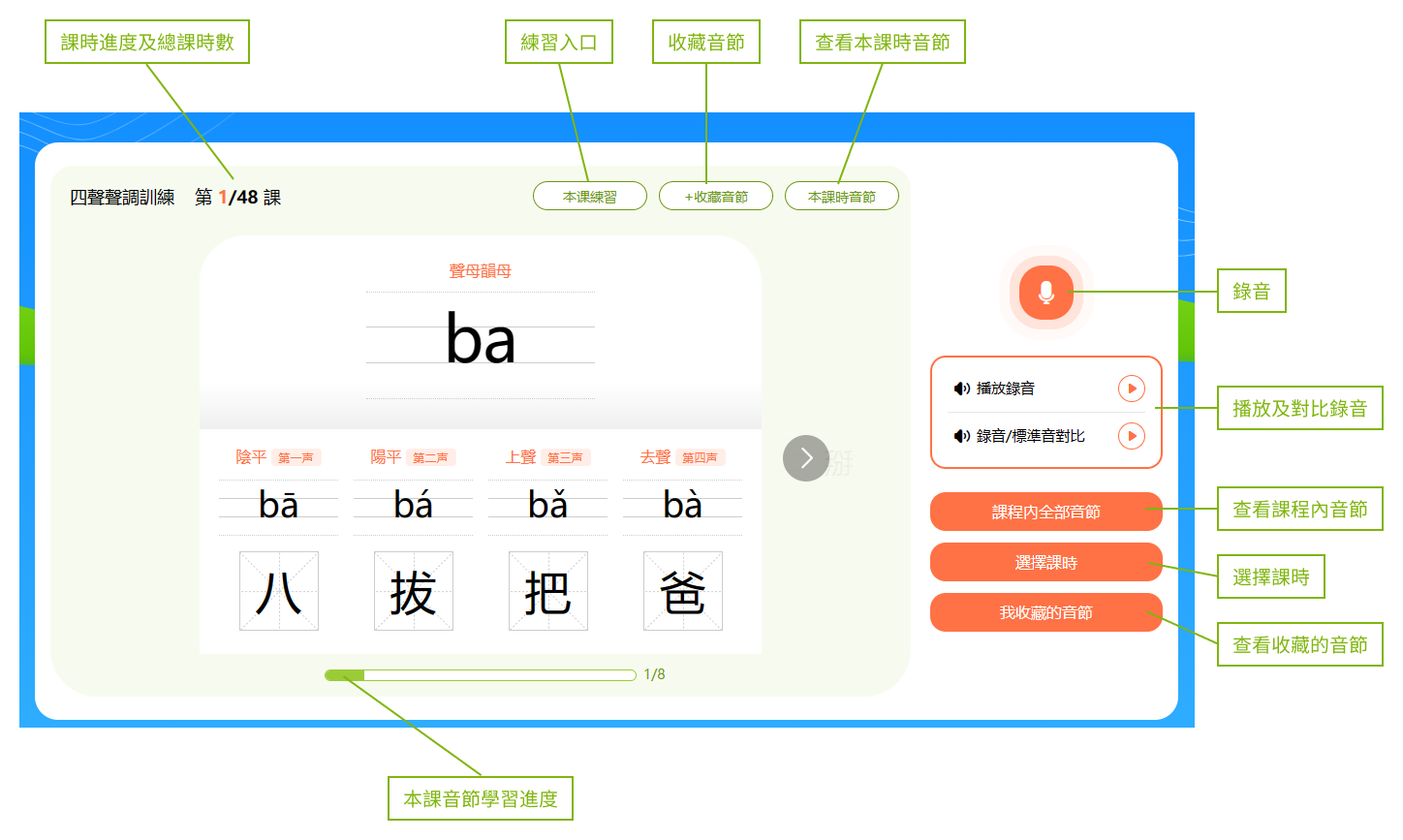 小提示:音節和漢字下方有一個進度條,會顯示本節課時的學習進度。
