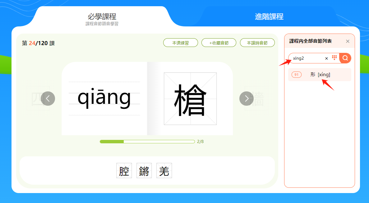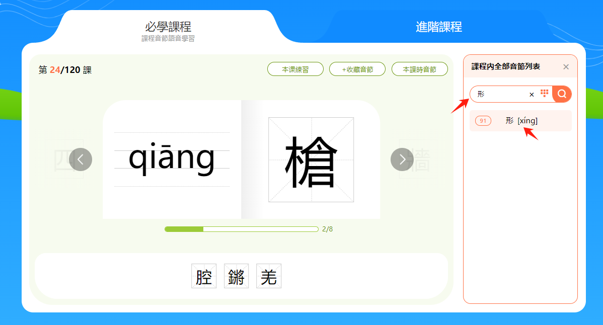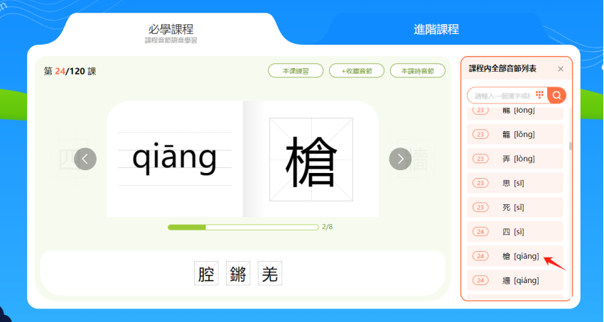 方法一:「課程內全部音節列表」按照課程順序羅列了本課程的所有音節,可滑動鼠標查找要學習的音節,找到之後點擊該「漢字[音節]」即可進入學習。