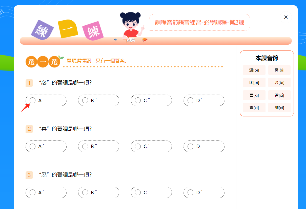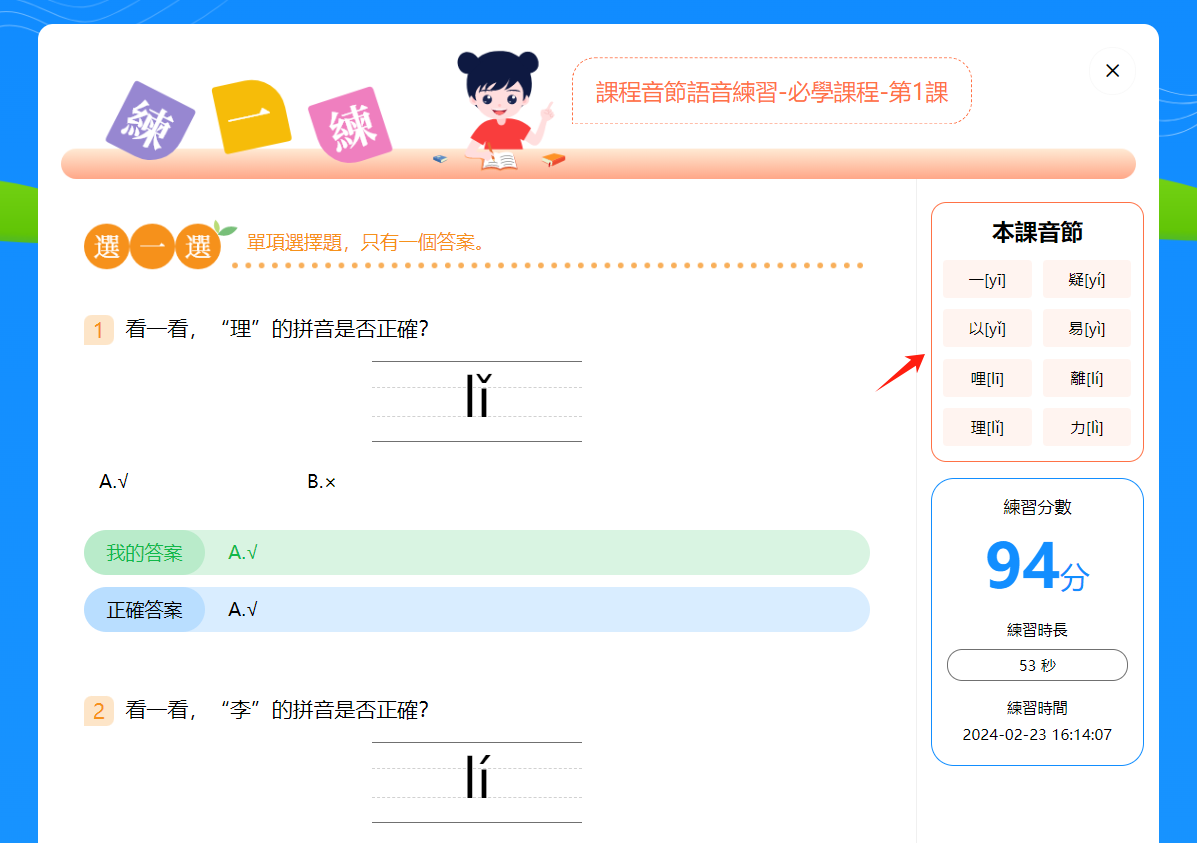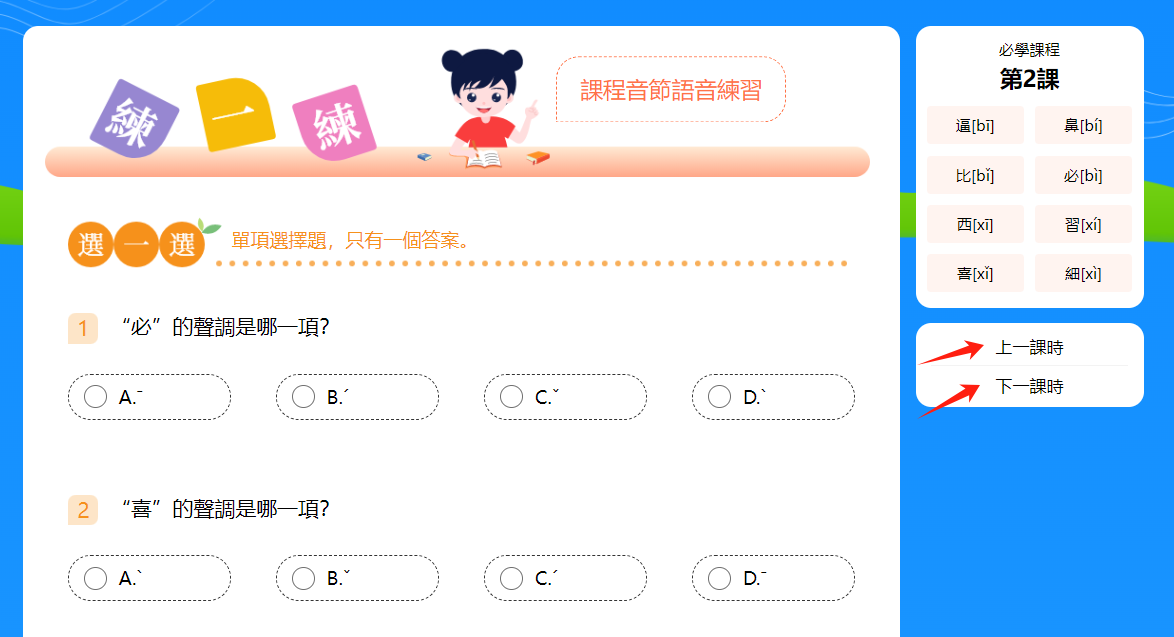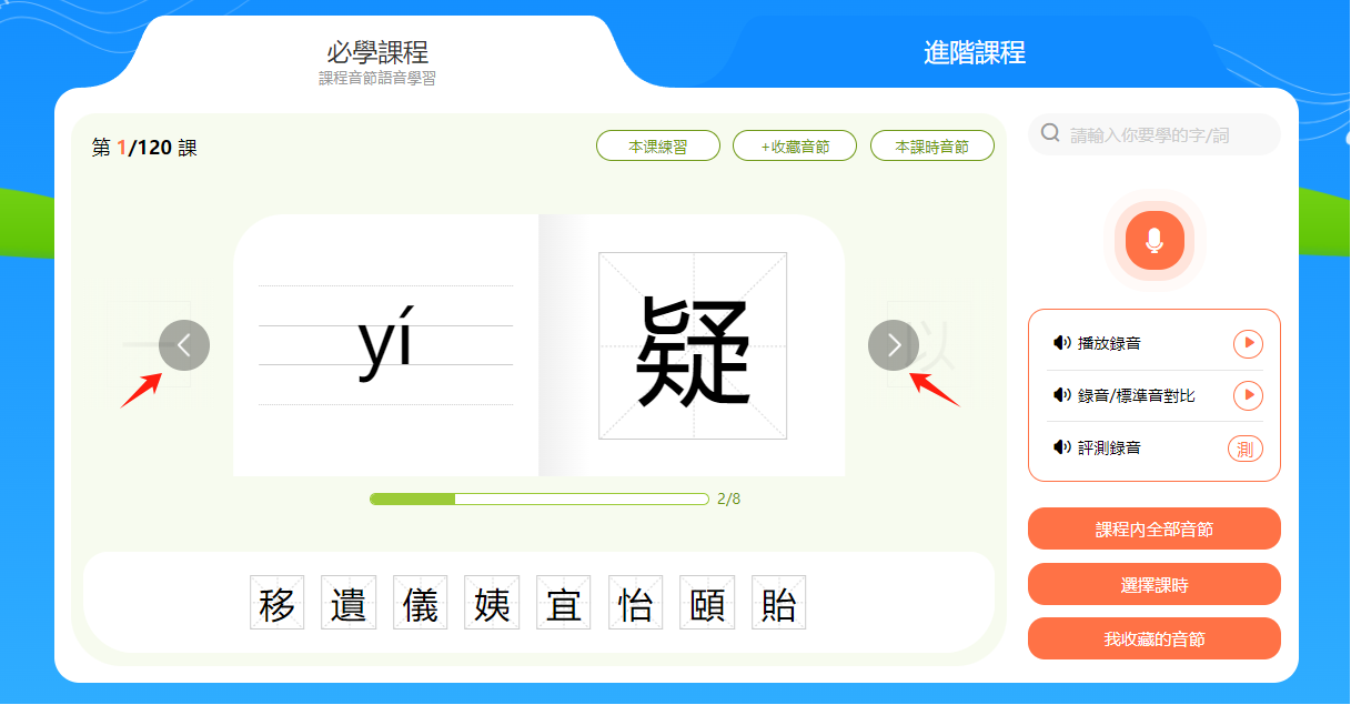 3.點擊音節/漢字旁的箭頭可切換學習的音節。