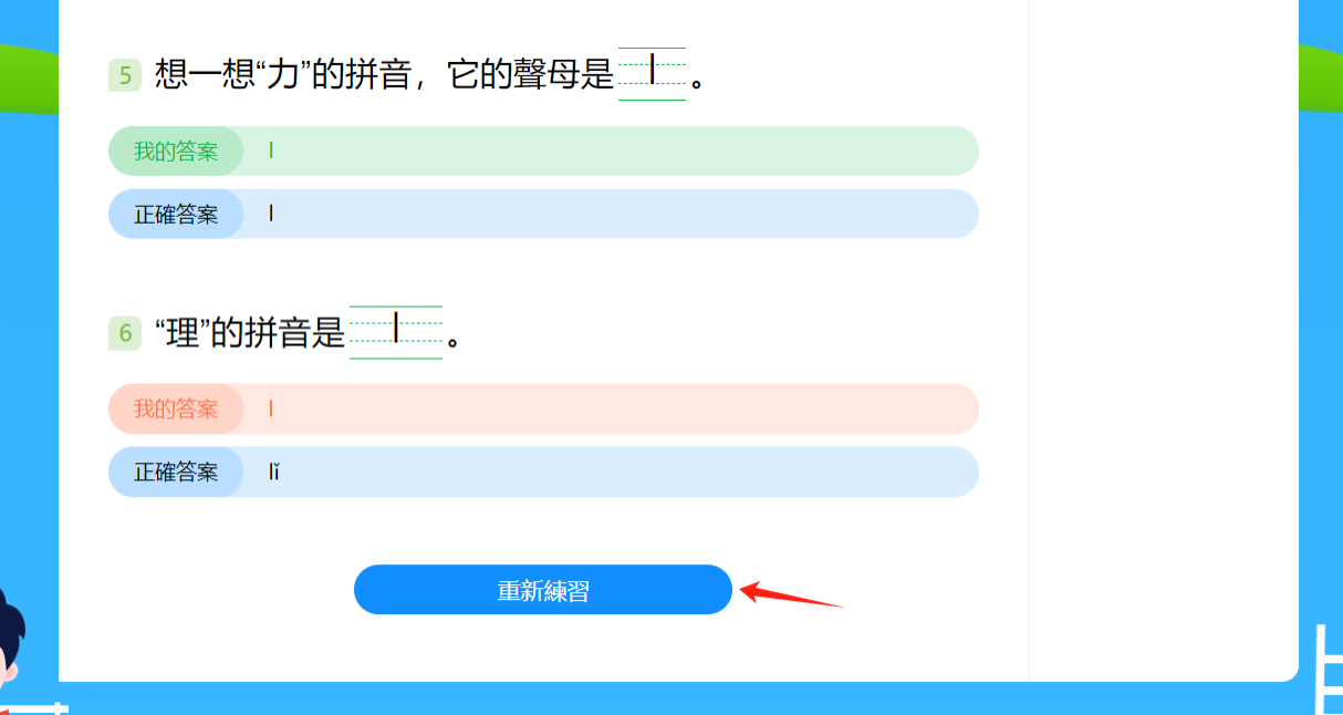 若對答題結果不滿意,點擊「重新練習」鍵可以再次進行檢測。