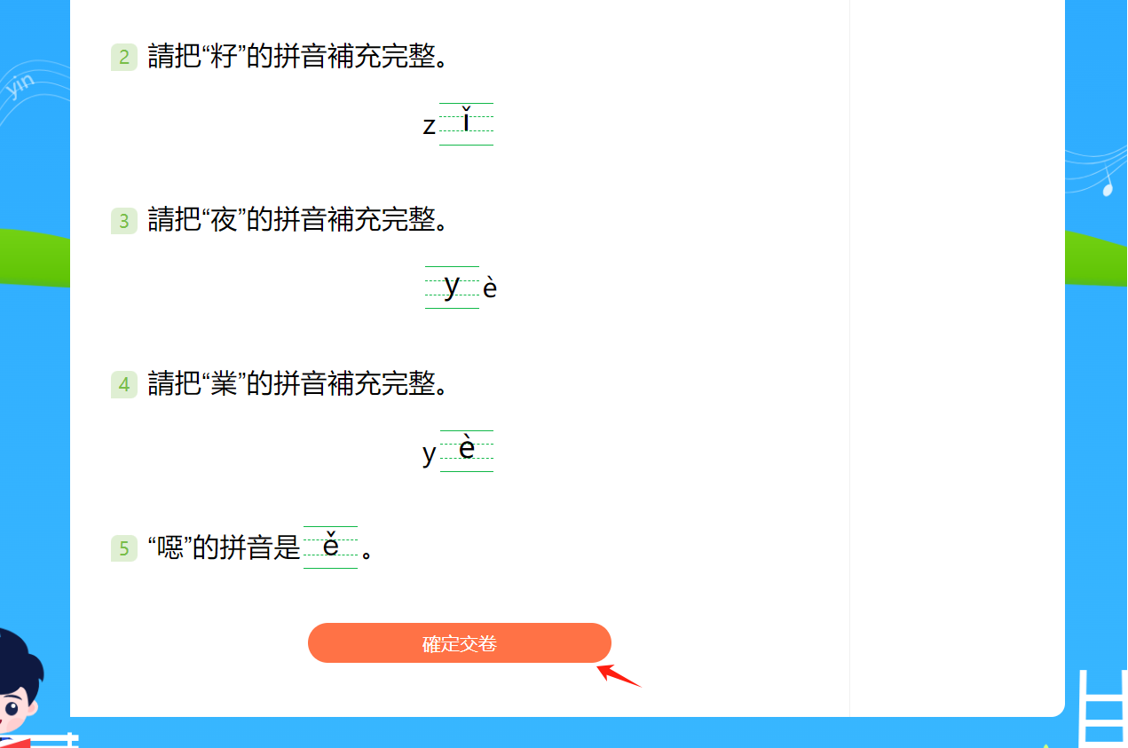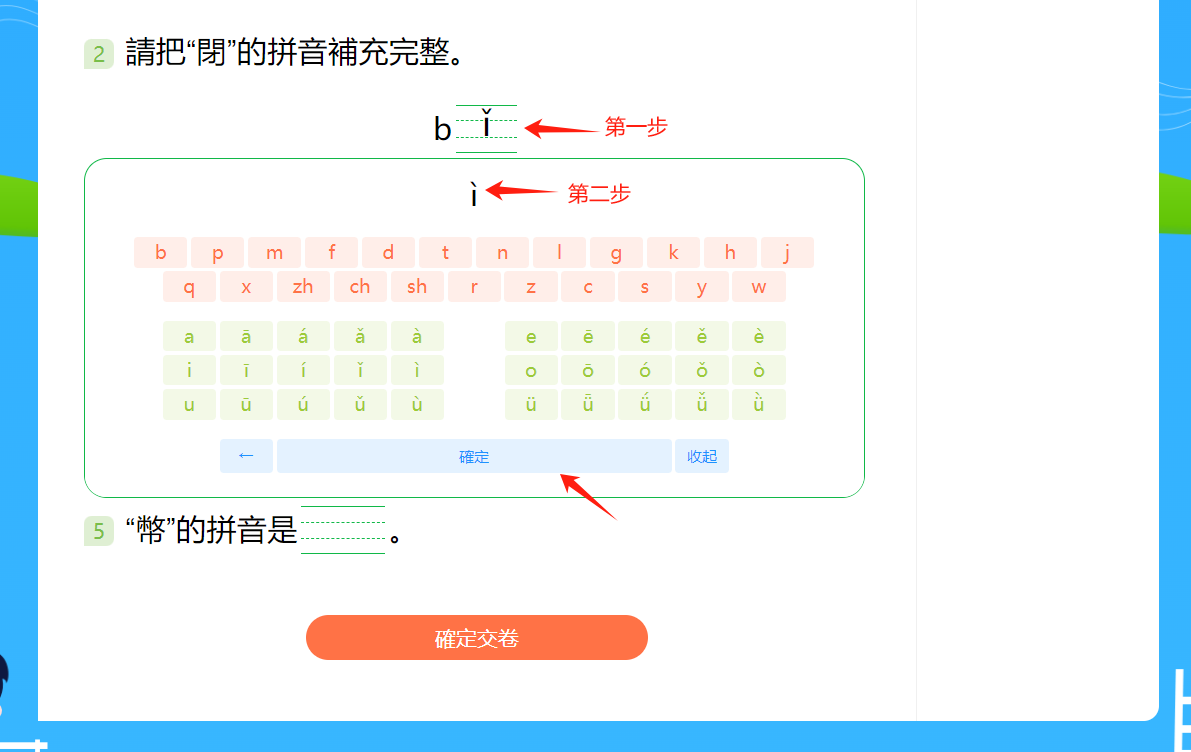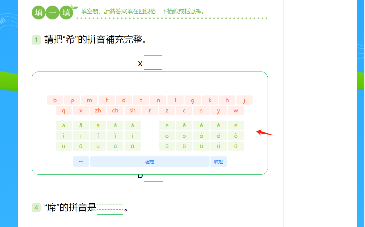 第二步:若需要填寫漢字,在使用設備上用鍵盤輸入/手寫輸入;若需要填寫聲母/韻母/音節/聲調,在網頁上的小鍵盤中輸入答案,然後點擊「確定」鍵。