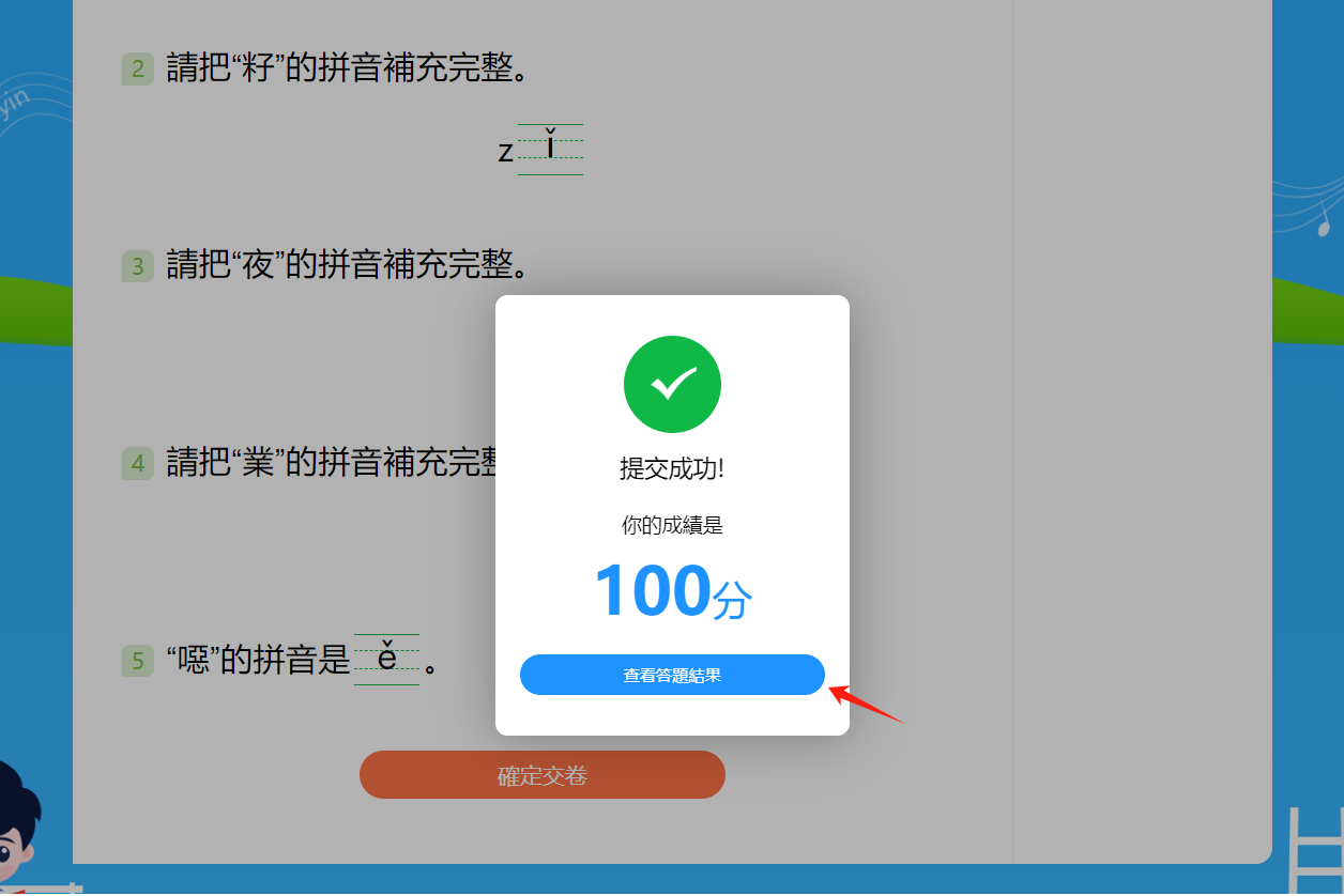 答完所有的題目之後點擊「確定交卷」鍵可提交試卷並查看分數。