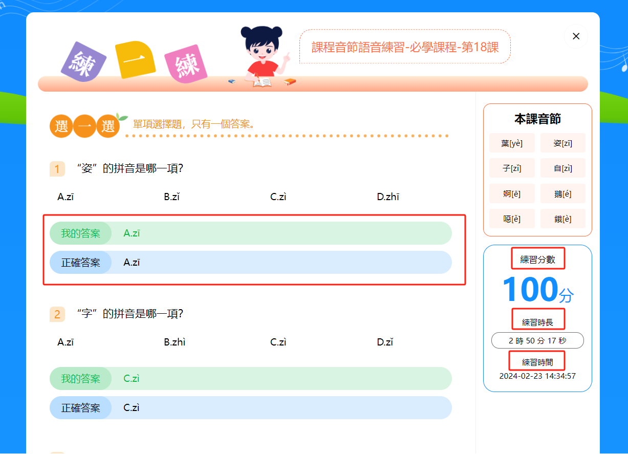 練習頁面的具體操作方法請參考本使用說明「二、學習普通話音節標準音」裏「(八)本課練習」中的練習頁面操作指南。
