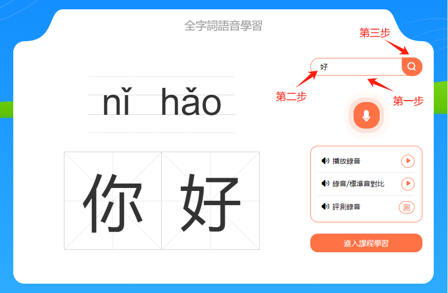本課程內的操作基本與「二、學習普通話音節標準音」對應的操作相同,可參考之前的講解文字。