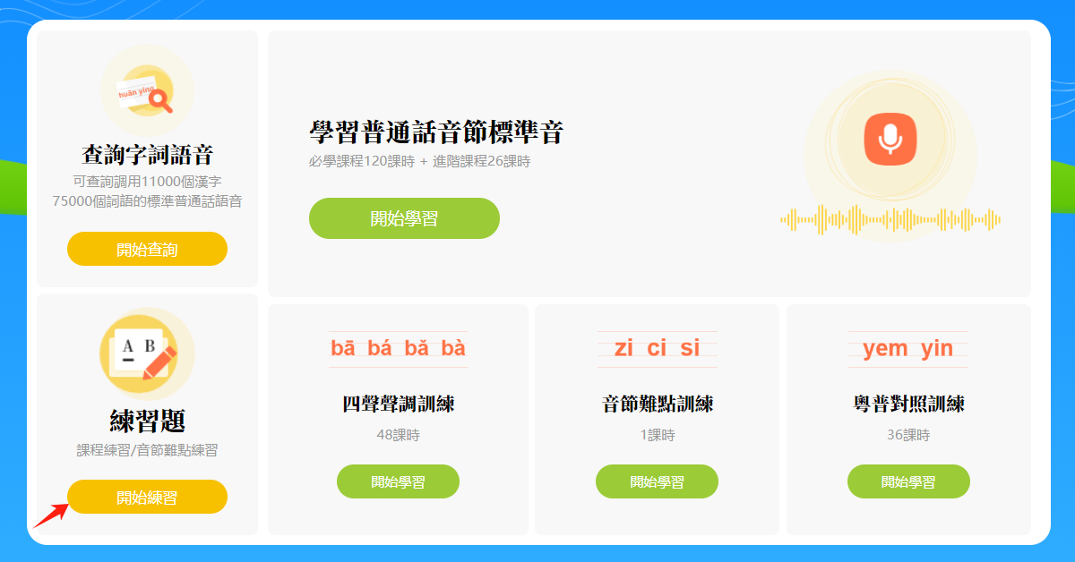 增加進入練習題的入口,方便集中做題。本部分涵蓋了「學習普通話音節標準音」、「四聲聲調訓練」、「音節難點訓練」中的所有練習題。