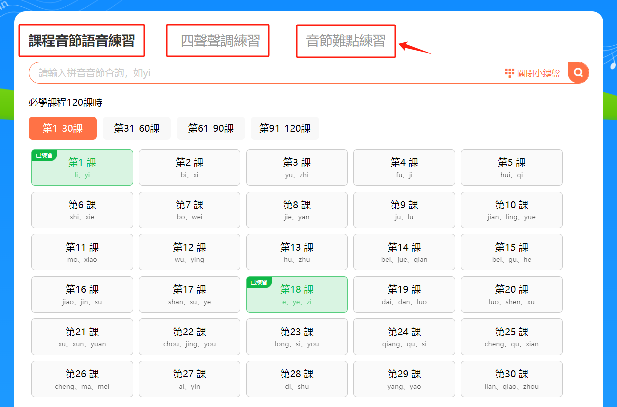 練習目錄頁面上方設置了三個欄目,分別是「課程音節語音練習」、「四聲聲調練習」、「音節難點練習」,點擊可查看該課程內的練習匯總。下方將三十個課時列為一組,點擊課時範圍後才能選擇該範圍內的課時習題。
