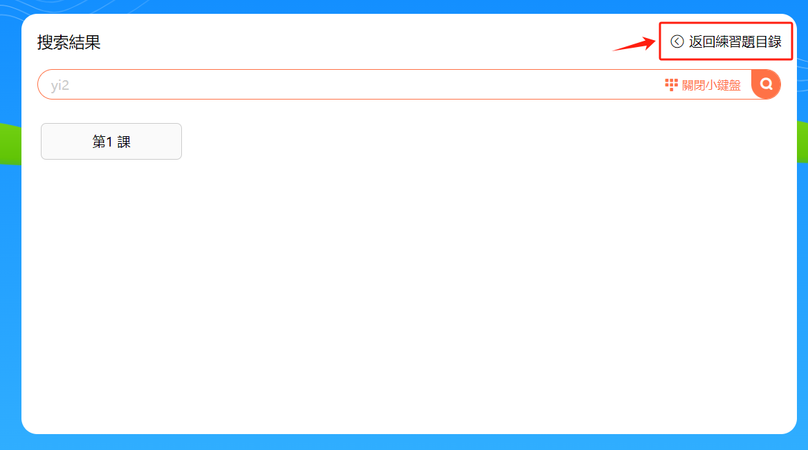在搜索欄中輸入拼音音節可查詢含有該音節的練習題課時,查到之後點擊該課時的小方框可進入練習。